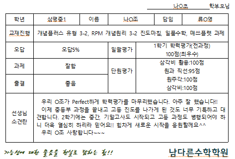 고1 선행 진입한 중1 학생 학습보고서입니다^^ 페이지 정보 작성자 관리자 작성일 25-07-24 20:08 조회 23 댓글 0 본문 진도 공백 없이 어려운 부분도 꾸준히 공부해와서 어느새 이만큼 앞서갔네요~ 기특한 친구 참 잘했어요~!! 이전글 3년정도 선행 중인 중2 학습보고서입니다~~ 다음글 내신대비 열심히 한 고2학생 학습보고서입니다~~ 댓글목록 0 등록된 댓글이 없습니다.