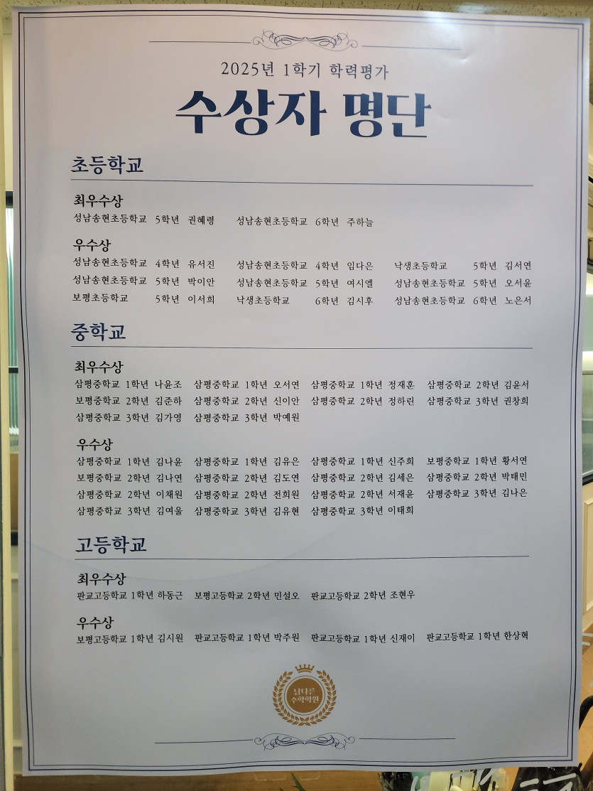 1학기 총괄평가 시상입니다~~ 페이지 정보 작성자 관리자 작성일 25-08-11 20:54 조회 36 댓글 0 본문 시험 전후가 가장 더웠던것 같은데~~ 고생했어요~~~ 이전글 예비고 학부형/학생 설명회가 있습니다~ 다음글 전단원 총괄평가 시상이 있었습니다. 댓글목록 0 등록된 댓글이 없습니다.